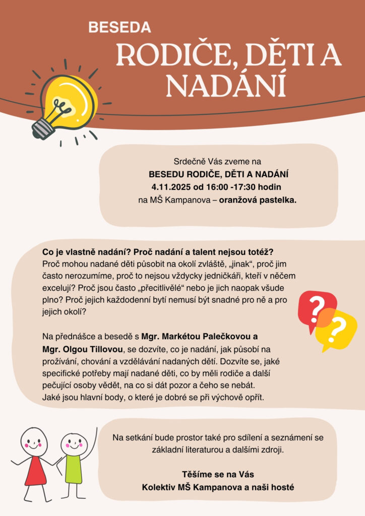 Albertova, Celoškolková, Kampanova Beseda Rodiče, děti a nadání Posted by albertova on 22.10.2025 Vážení rodiče, zveme Vás na Besedu pořádanou v MŠ Kampanova na téma Rodiče, děti a nadání. Více informací v letáčku. Na akci jsou zvání rodiče MŠ Kampanova i Albertova.