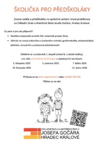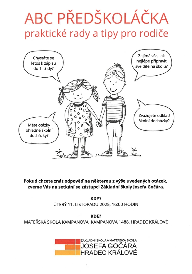 Albertova, Celoškolková, Kampanova Pozvánka na setkání se zástupci ZŠ J. Gočára Posted by albertova on 22.10.2025 Vážení rodiče, zveme Vás na besedu se zástupci ZŠ J. Gočára. Akce platí pro obě pracoviště. V mateřské škole Kampanova se koná 11.11. 2025 V mateřské škole Albertova se koná 13.11.2025.